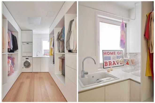 比如在衣帽间里设计一组洗衣柜,将洗衣机和烘干机内嵌进去,再临窗设计个洗衣台和晾衣杆,不仅实现了“洗晒收”的人性化动线,还彻底释放了阳台的空间。