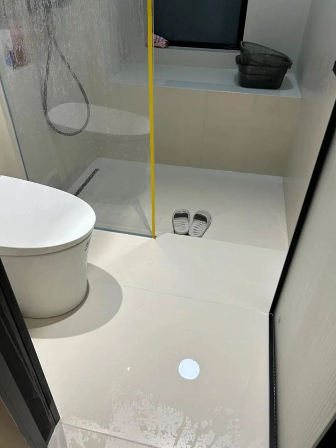 可真正入住后就会发现,半块玻璃隔断根本就不挡水,每次洗完澡后,整个地面到处都是水。