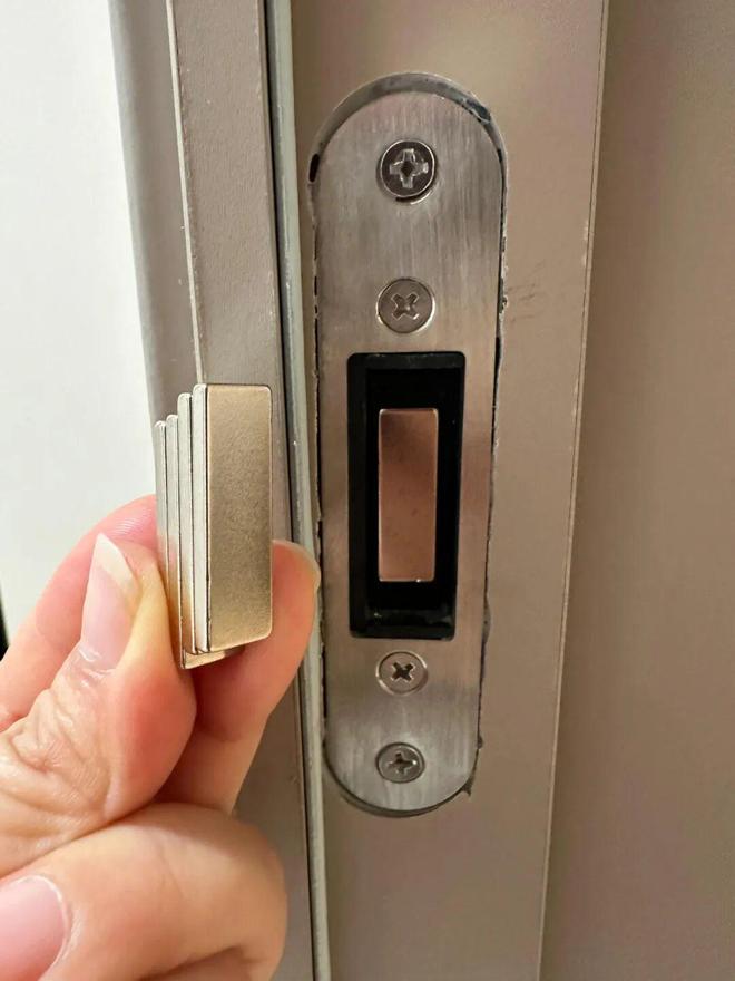 除此之外,磁吸门锁的磁片用久了,还会出现磁力削弱问题;并且磁片上稍微粘点脏东西,门就会锁不上。