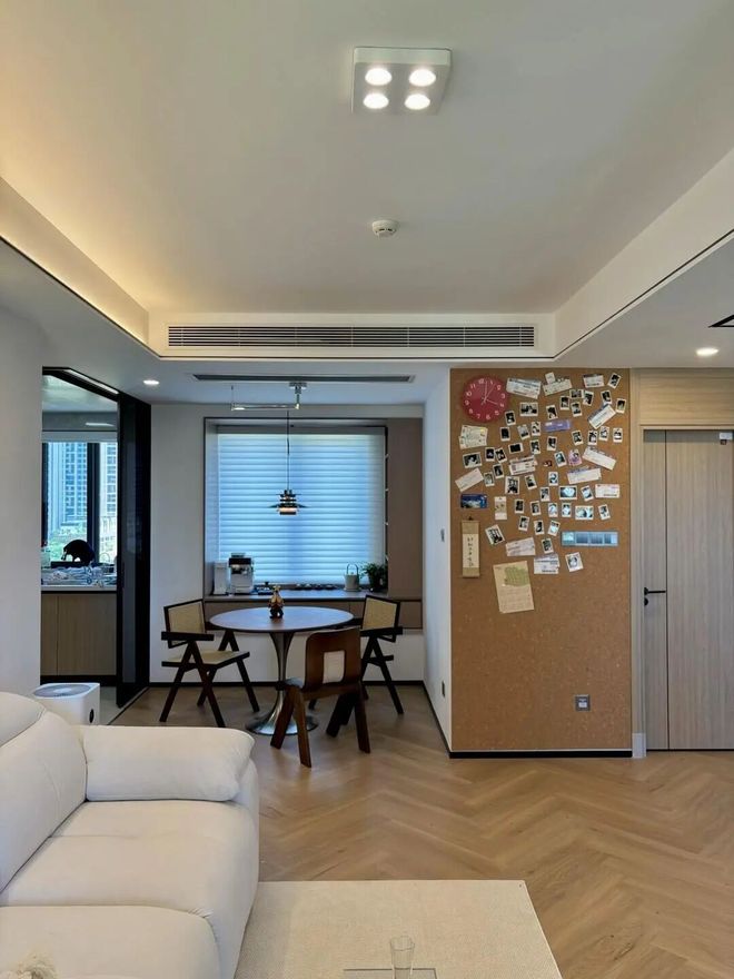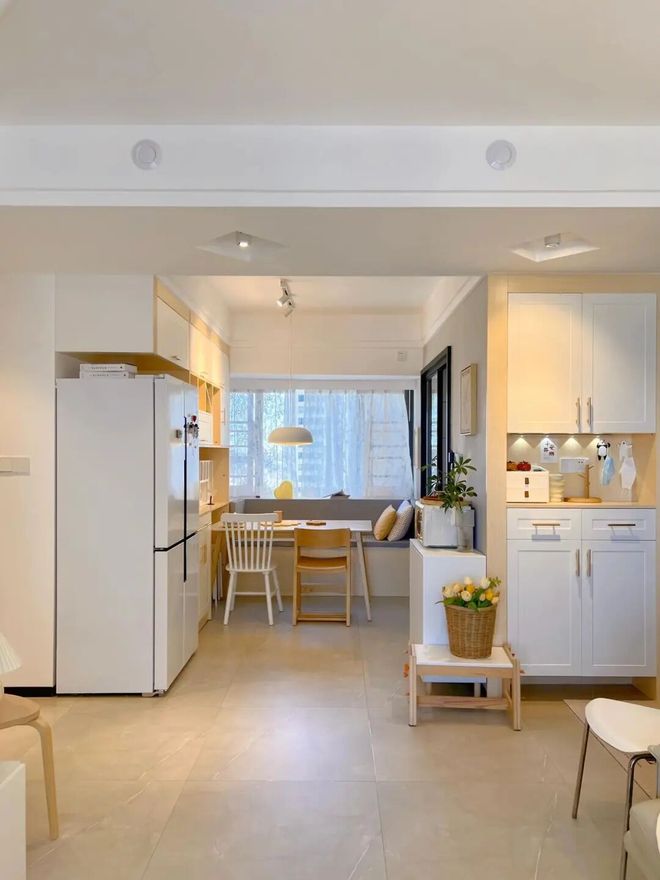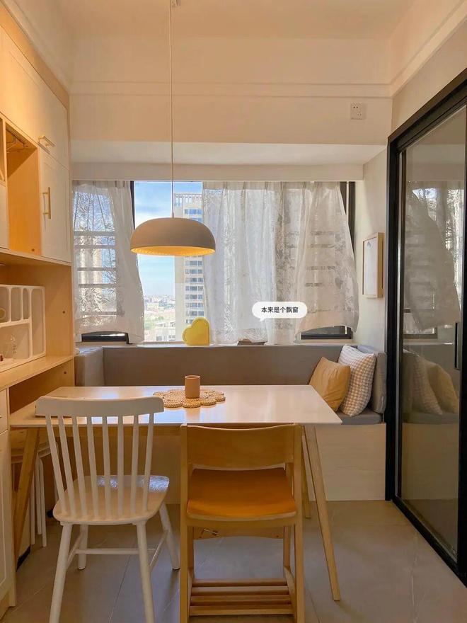 原本以为飘窗是小户型的硬伤,没想到它却成了我的“救命稻草”。47cm高的窗台+5cm的坐垫,再搭配一张餐桌,摇身一变就成了一个卡座式用餐区。