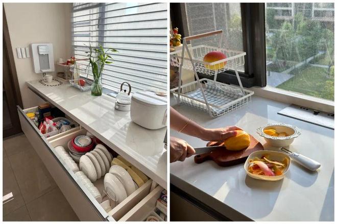 现在不仅有了一定的收纳力,还方便了一些小家电使用,且平时切水果什么的也都可以在这里完成,非常好用。