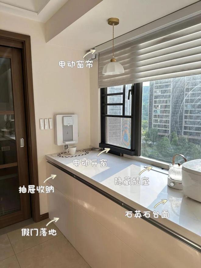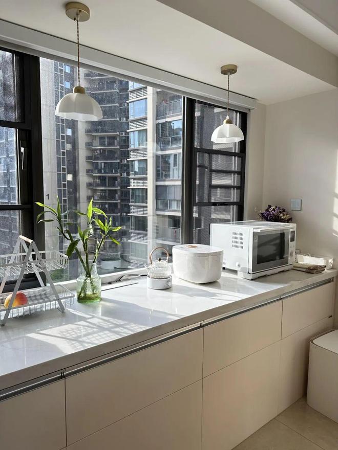 到底是谁在说餐厅飘窗台很鸡肋?把它改成水吧台难道不香吗?45cm的飘窗+25cm的抽屉柜,整体高度刚刚好。