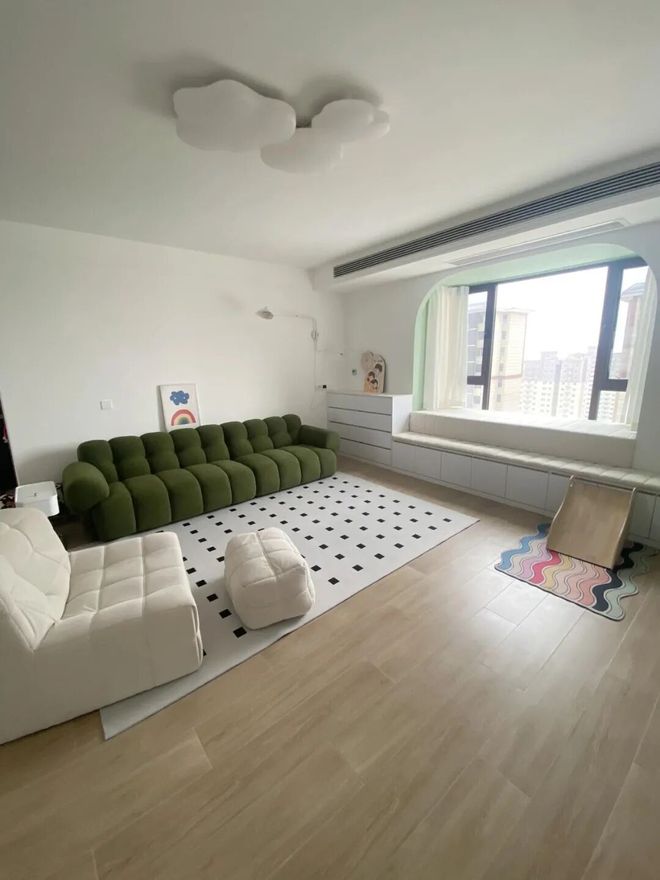 飘窗下面做一排深度35cm,高度35cm的储物柜,台面再包上软包垫,可以用来收纳,也可以用来休息,还可以给孩子玩。