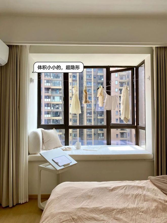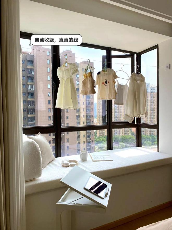 平时用来晾晒内衣内裤,彻底避免了晾在阳台的尴尬,并且还丝毫不影响飘窗休闲。