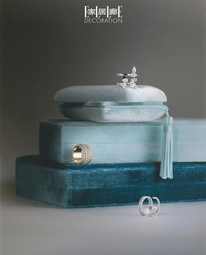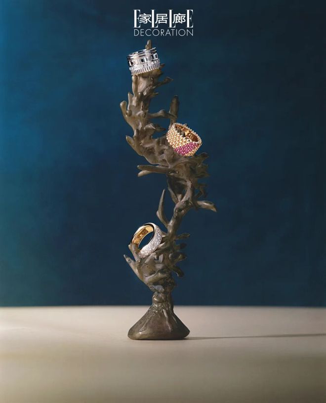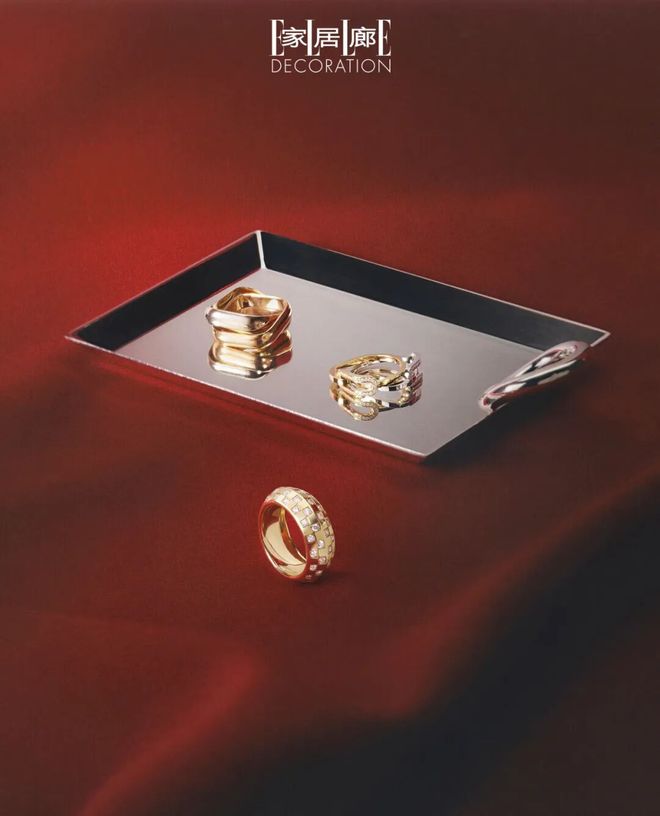 璀璨星空之中,戒指们高踞其座,在静谧的光线中交织出微妙的平衡感,将黄金与宝石的璀璨光辉尽情展现。