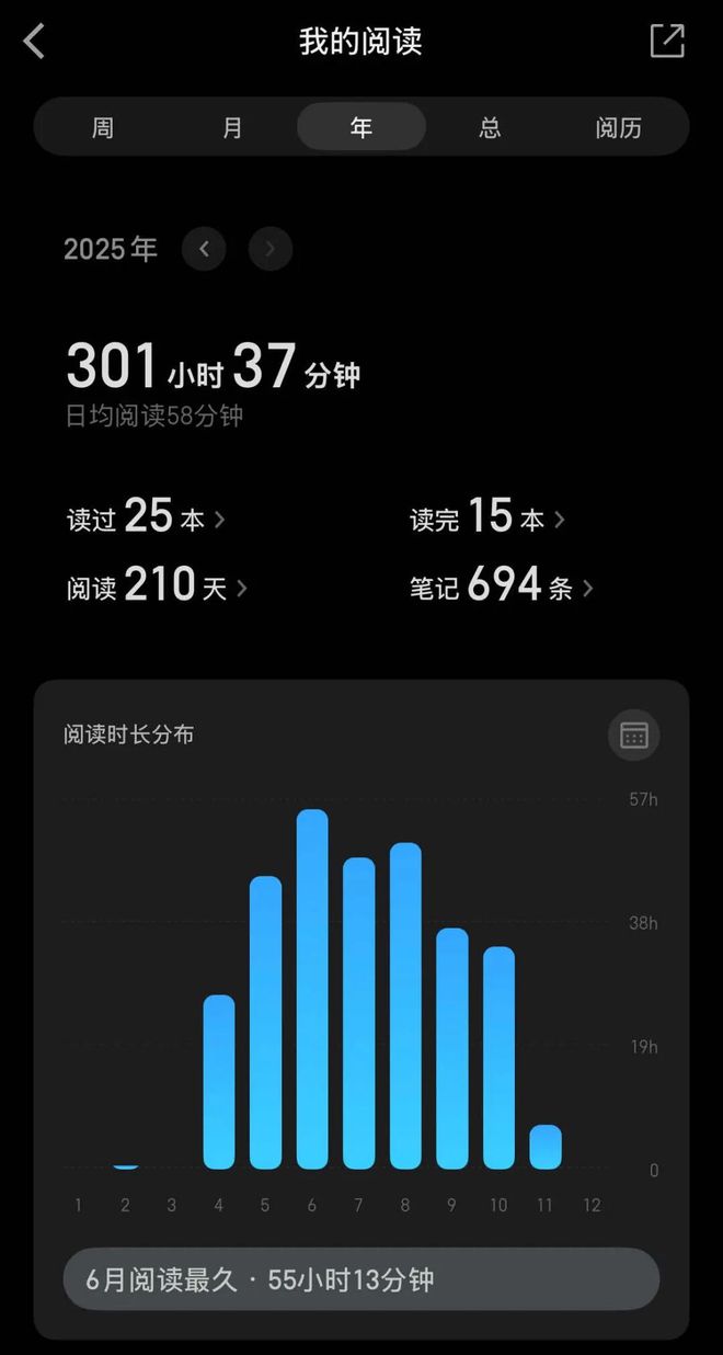 4月:24小时36分《霍乱时期的爱情》;5月:31小时23分《生死疲劳》;6月:37小时20分《丰乳肥臀》、24小时38分《沧浪之水》;7月:20小时56分《檀香刑》、12小时41分《清单人生》、12小时58分钟《东京八平米》;8月:13小时49分《我与地坛》、7小时36分钟《呼兰河传》、19小时53分钟《我才不想做家务》;9月:17小时39分《蛙》、8小时28分《活着》、11小时55分钟《你的夏天还好吗?》;10月:29小时21分钟《一句顶一万句》、44分钟《退休后,她们去留学(轻纪实)》;截至今天11月6日,用时21小时33分钟读至《百年孤独》的60%。