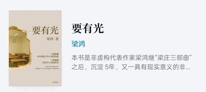 楼上推荐了梁鸿的《梁庄三部曲》,我推荐她的新作《要有光》,让我真正下定决心、做出行动改变了教养方式,现在我和孩子都能更轻松得一起面对成长、学习中的问题,这本书让我看到、懂得、行动,我相信自己能成为更好的人、更好的母亲。