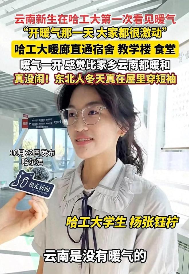 最近,哈工大开启暖气第一天,有来自云南的学生对着媒体坦言:“开暖气第一天,大家都很激动,感觉比家乡云南都暖和!”