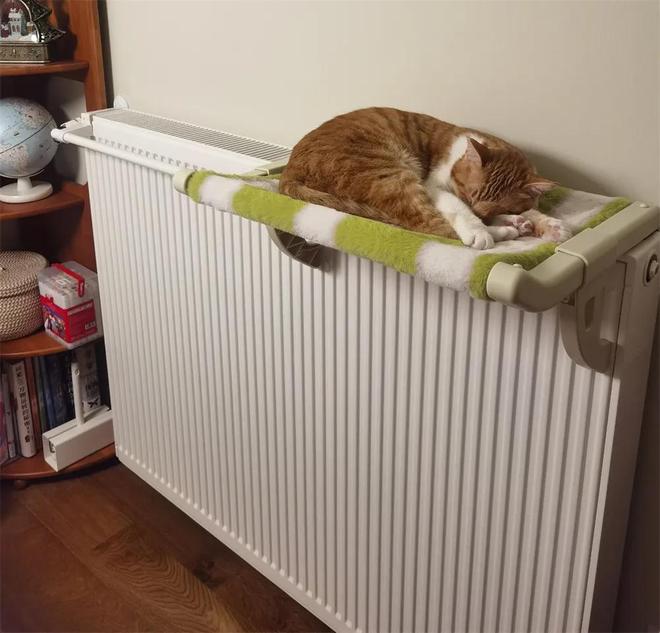 此时,家里如果有暖气片的话,就可以在上面安装了个支架式猫窝,小猫每天都会在旁边贴着,有时候甚至能在上面窝着睡上一整天,那场面,只是看着都觉得很温馨。