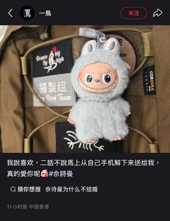 另外,摄影师发上Labubu照片,并写道:“我说喜欢,二话不说马上从自己手机解下来送给我,真的爱你!佘诗曼。”