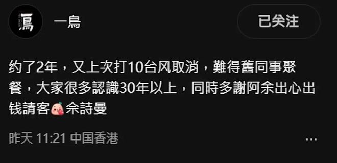 阿佘不是,她拍完《新闻女王2》有空了,就真的邀请包括梳化服、摄制团队在内的一众旧同事聚餐,其中一位有份出席的摄影师写道:“难得旧同事聚餐,大家很多认识30年以上,同时多谢阿佘出心出钱请客。