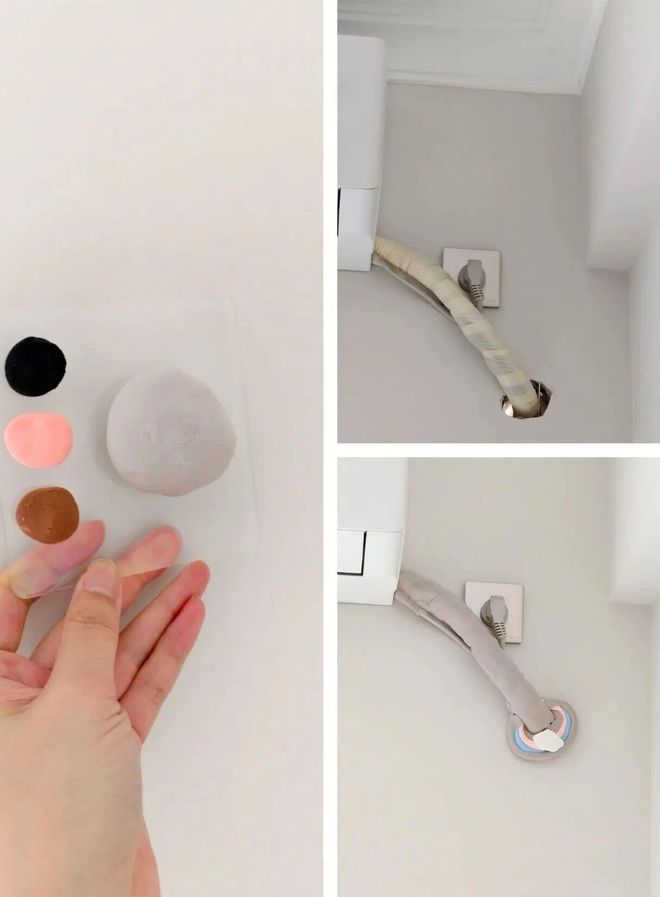 网友@阿尼亚冲冲冲:安装空调时,考虑到师傅用的白色胶泥和自己家墙面颜色不搭,立马想到孩子玩的黏土和家里的墙面颜色接近,就自己处理了一下,没想到效果还不错,甚至空调管都被我包上了黏土。