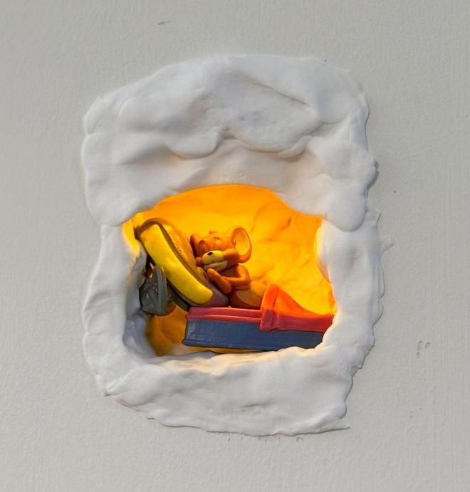 只需要将插座盒里的电线做好绝缘处理并清理干净,接着把黏土糊进去,再放一个迷你感应灯和卡通玩偶就行了。