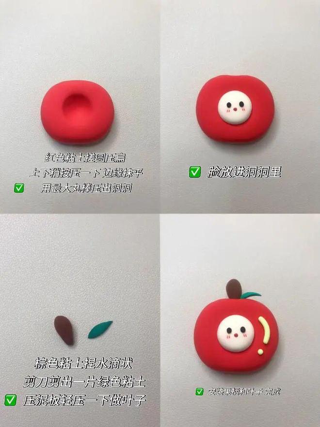 2)平安果:红色黏土搓圆压扁,边缘抹平后再找个棒子压出洞洞,最后放进笑脸,捏出苹果叶就行了。
