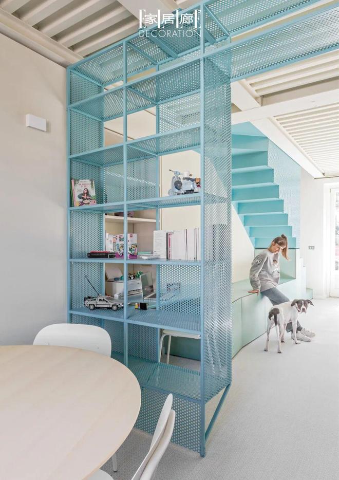 蓝粉配色为空间带来清新与明亮,然而,团队的构思不止于此。他们在设计中还融入了铁艺元素,如储物柜和楼梯旁的金属构件,为空间注入一丝精致的工业现代感。此外,透明材质的巧妙运用,则在视觉上营造出迷人的通透感与轻盈感。