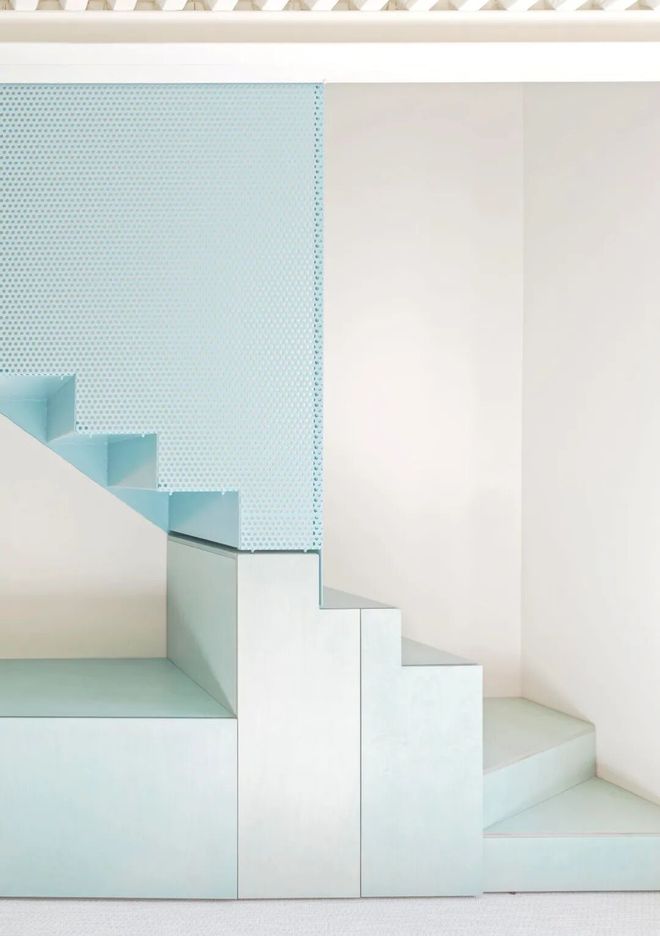 楼梯、隔断墙与储物柜均以微妙差异的蓝色调呈现。