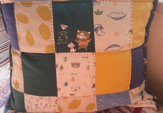老妈是把我家里的不同颜色图案的旧衣服,弄成布料,然后有的裁剪成方形,有的是三角形的形状,就像拼图一样,拼接缝合,就把制作了充满个性的抱枕。甚至,一件衣服直接都可以作为抱枕套。