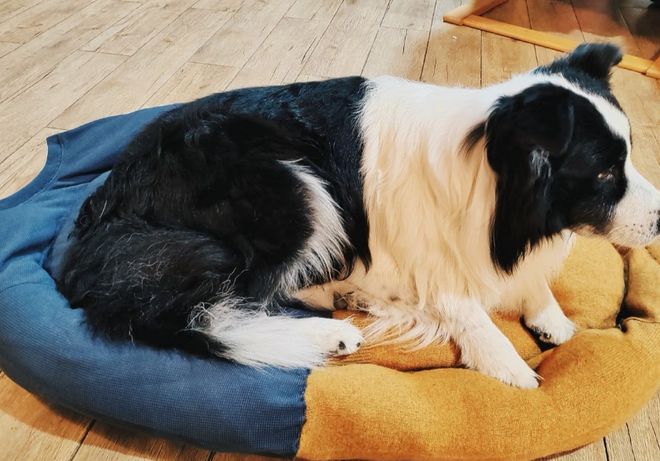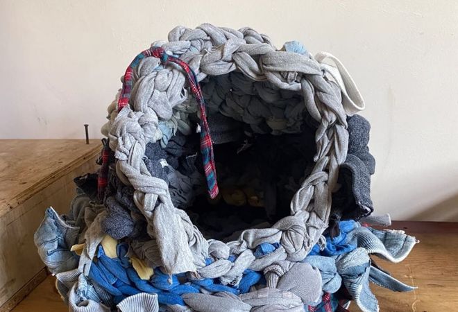 我家里的宠物小窝是我老妈用旧毛衣和蓬松的填充物制作而成的。做法就是将两片毛衣布料面对面缝合,然后留一个口,之后翻过来填入填充物,把口封上就完成了。