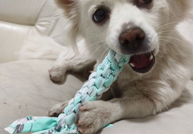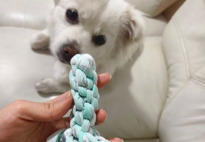 只要家里有一些旧衣服,就可以制作。将不同颜色的旧布条,可以编成坚固的麻花辫,两端上打上死结,就做成了一个简单的拉扯玩具了。或者是用布料缝成小球,里面塞入一个会响的塑料瓶盖就可以了。