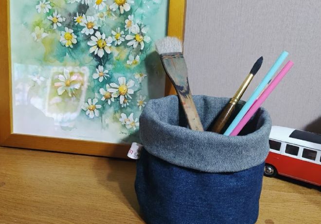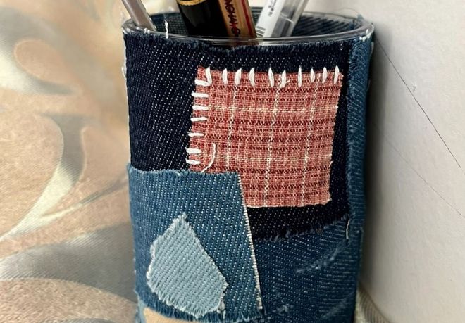 做法建议:在制作时,牛仔裤的口袋不要拆,整个剪下,直立放置,你会发现竟然能够用来收纳数据线、小工具。而且,口袋本身也是一个分类格,很好用。