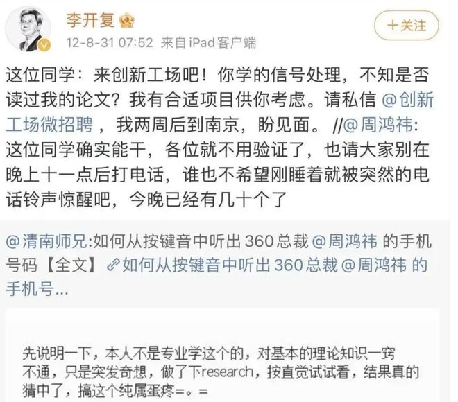 一头雾水的周鸿祎上网一看,才发现自己的手机号竟被一个南京大学的学生破译了,而且还被挂在了网上。
