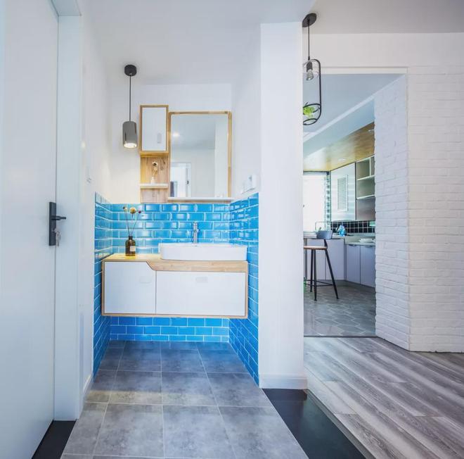▲洗手盆装在走廊区域,墙脚区域装着海蓝色的墙砖,壁挂洗手盆刚好嵌入中间位置,紧凑的空间也利用得舒适大气。