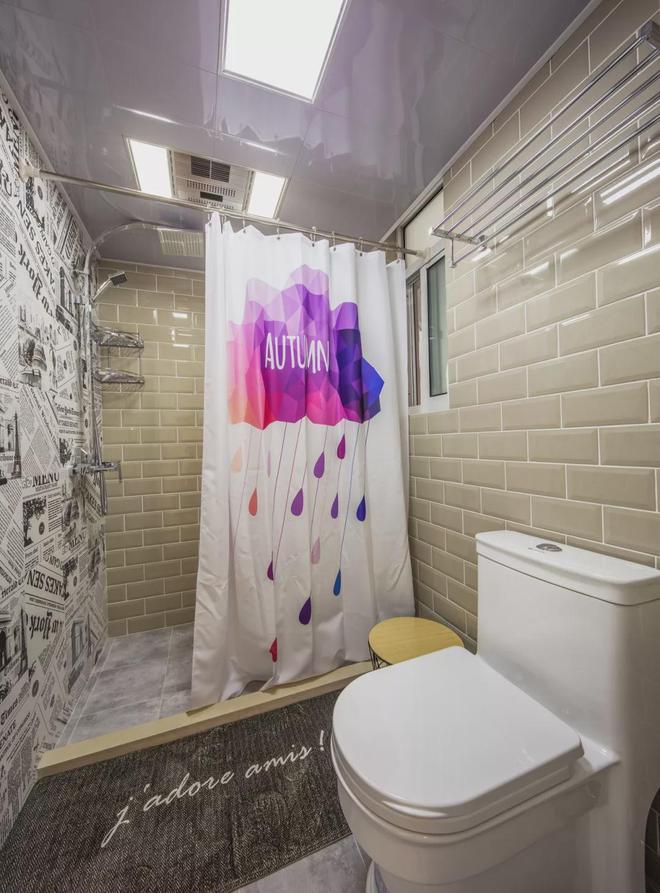 ▲卫浴区的墙面砖在暖灰色面包砖基础,安装花洒的这面墙则是以独特的报纸图案纹理的设计,淋浴区外铺上舒心的地毯,最大化地保障居家空间的干湿分离与安全。