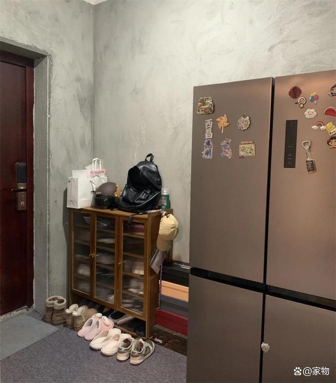 推门进入家中的玄关后,有一个单独的玄关,原本是预留有做定制玄关柜的空间,但现在只是放下一组小号的成品鞋柜,方便收纳两人的鞋帽和随身用品,甚至为了节省空间,连大冰箱也直接放在了玄关里。