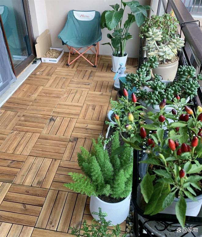 现在的阳台,直接铺上防水户外木地板,再放上几组花架,在这里养花种草别提多合适了,更不用说,这开放式的阳台在一定程度上也释放了毛坯房昏暗的氛围感,为家居空间增添了几分生机与活力。