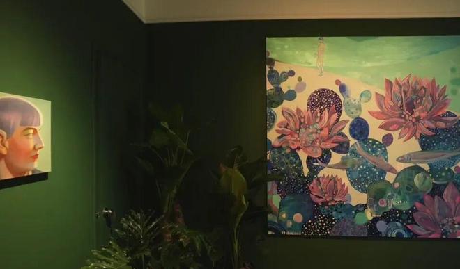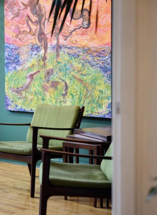 为了营造这种沉浸式的“家”的氛围与情感记忆,墙面成为关键。她与团队在立邦魔术漆丰富的质感中,最终选定了微晶石效果的绿色。“那个绿色非常美,它在不同光线下有细腻的反光,与艺术品、我们布置的热带植物交相辉映,让整个空间融为一体,充满了那个特定记忆中的情绪与生命力。”借由这样的材质,她成功地将私密的情感和记忆,转化为了可被公共感知的、充满生命力的场域。