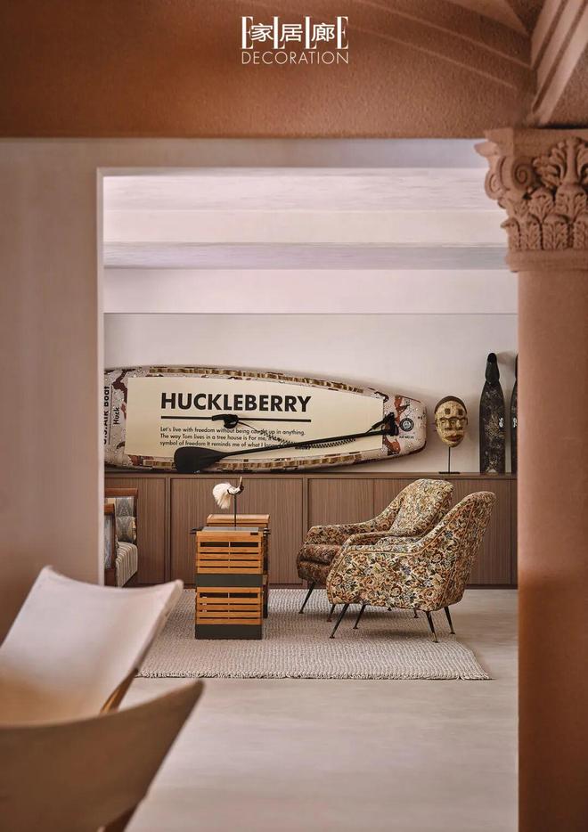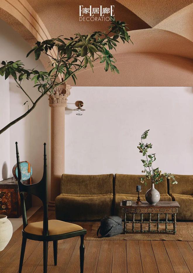 地下一层的连廊是霍思燕家最具代表性的空间之一,赤陶色拱顶结构勾勒出独特的建筑语言。当初,霍思燕问先生连廊要怎么改造,杜江脱口而出就是“摩洛哥风格”。杜江早年拍摄《红海行动》曾在摩洛哥待了五个月,沙漠的苦与热反倒让他熬出了感情——连廊的拱顶结构让人联想到欧洲传统建筑,石膏柱刻意做出粗犷的纹路,真石漆极具颗粒感,墙角瓷砖拼贴出的沙漠色块,就像把北非的阳光与故事,都拓印在了家里。