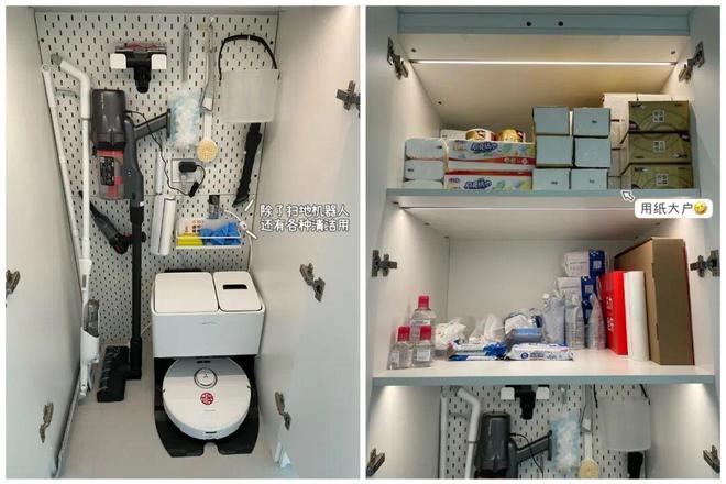 值得一提的是,珐琅板对面的卫生间干区,还做了一组家政柜隔断,主要用来收纳杂物和扫地机器人,一点空间都没有浪费。