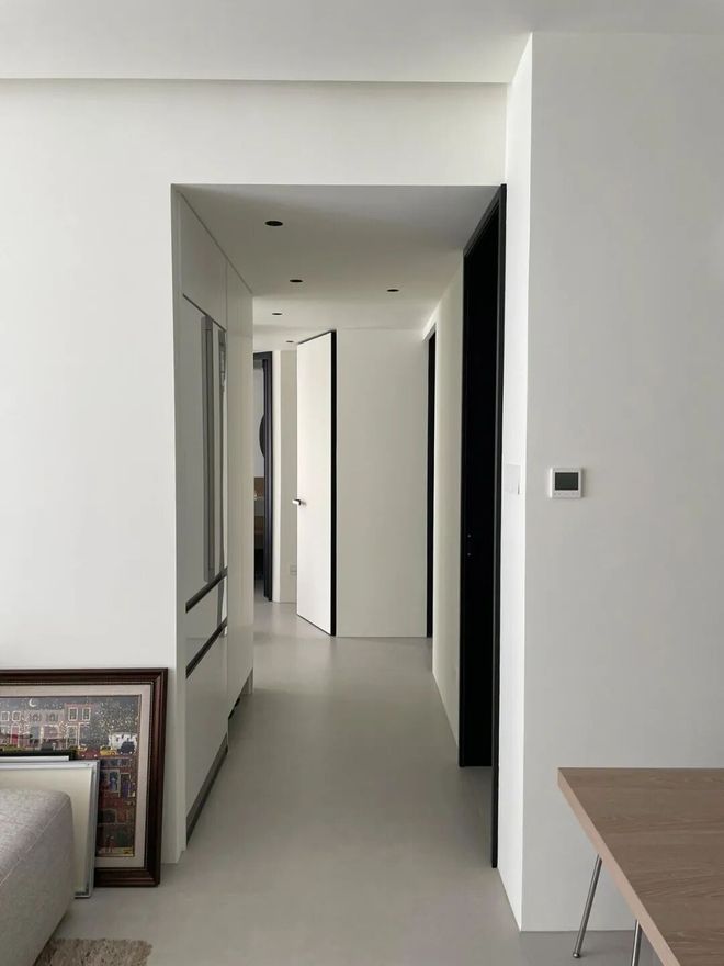 另外,由于次卧门洞往内退了,主卧的门洞也往左做了偏移处理,搭配上极简平板门,整个过道看起来既高级又简约。