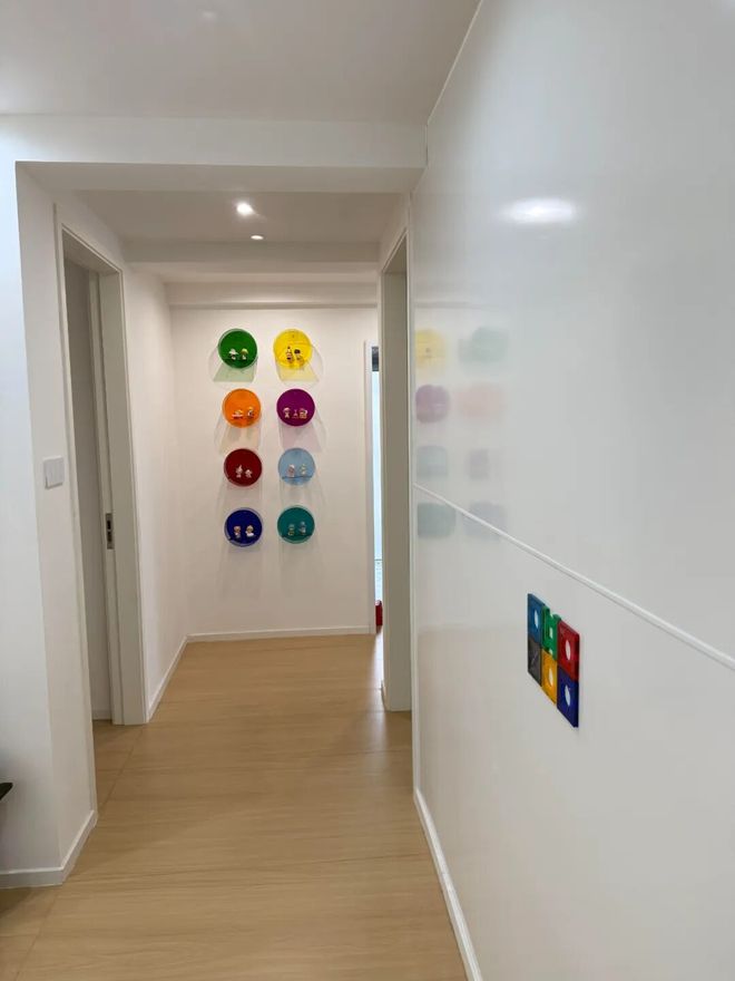 家里这条2m多长的走廊,是两个娃每天跑来跑去最多的地方之一。当然要变得好玩一点啦,所以就做了满墙珐琅板设计。