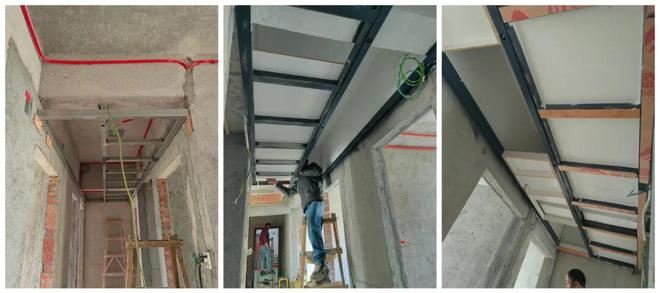其次,用轻钢龙钢+木板封掉了走廊50cm高的梁,并留了两个80*40cm的洞,以此形成了一块超大的储物空间。