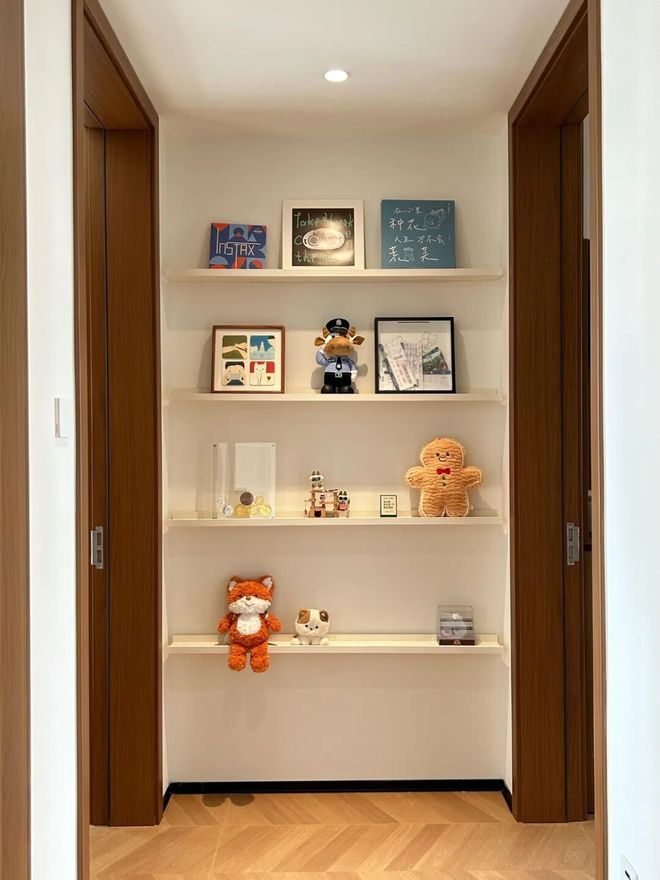 小tips:不仅仅是走廊墙面,端景墙同样可以安装绘本架,相较于挂画,这种设计显然更加实用美观。