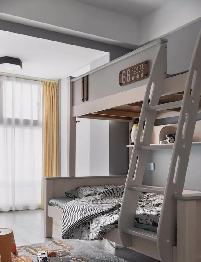儿童房以淡蓝色的墙面空间,地面布置一席交通主题的地毯,摆上玩具为孩子提供了童趣满满的玩耍空间;白色+浅蓝色的上下床,边上一个仙人掌造型的落地衣帽间,也是增添了空间的实用与童趣气息。