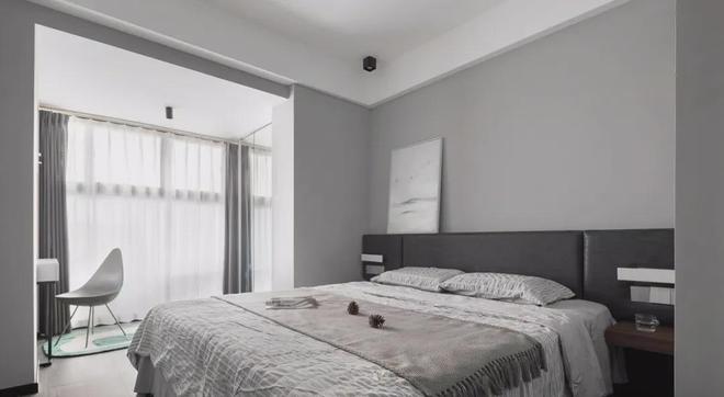 现代简约的卧室以浅灰色的空间,床头墙脚区域加入黑色的软包靠背,靠放一幅简约洁白的装饰画,布置上灰色条纹的床单,也让空间显得更加舒适自然,在窗边布置收纳柜与梳妆台,也是显得实用而方便。