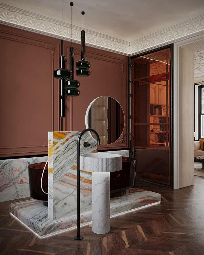上到三层直接被浴室惊艳到!深酒红色浴缸像块发光的宝石,下面叠着大理石平台,橙灰奶油色的石材纹理在光下流动,瞬间有了温度。陶土色墙板做背景,配着哑光黑五金件,复古又摩登,连洗漱都变成一种享受✨