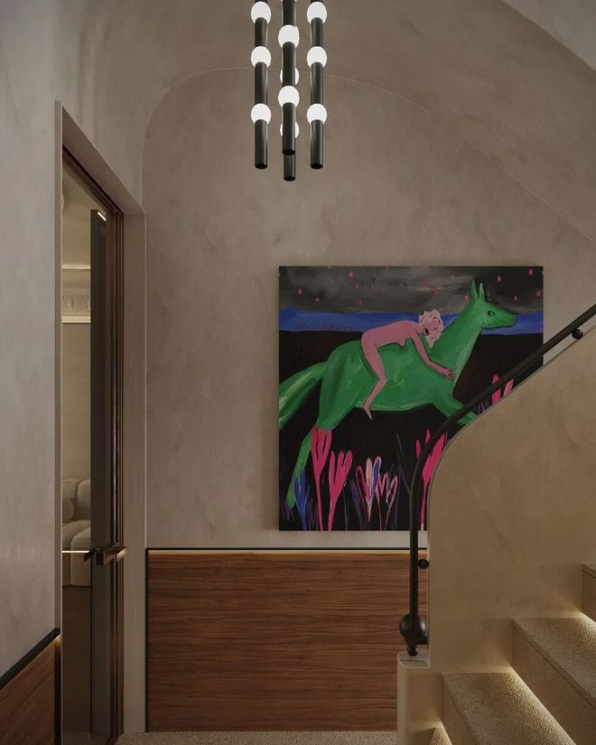 必须夸夸楼梯这个“故事线”!木饰板、柔光台阶自带缓冲感,走在上面安安静静的,墙上的当代艺术品突然跳出来添一抹亮色,从一层的烟火到三层的雅致,过渡得丝滑又自然。