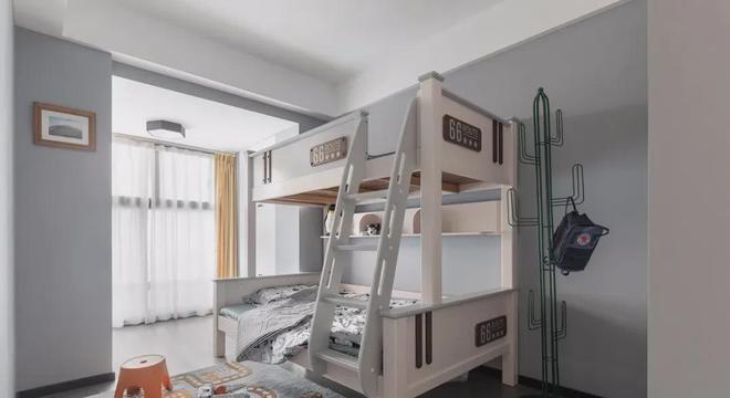 儿童房以淡蓝色的墙面空间,地面布置一席交通主题的地毯,摆上玩具为孩子提供了童趣满满的玩耍空间;白色+浅蓝色的上下床,边上一个仙人掌造型的落地衣帽间,也是增添了空间的实用与童趣气息。