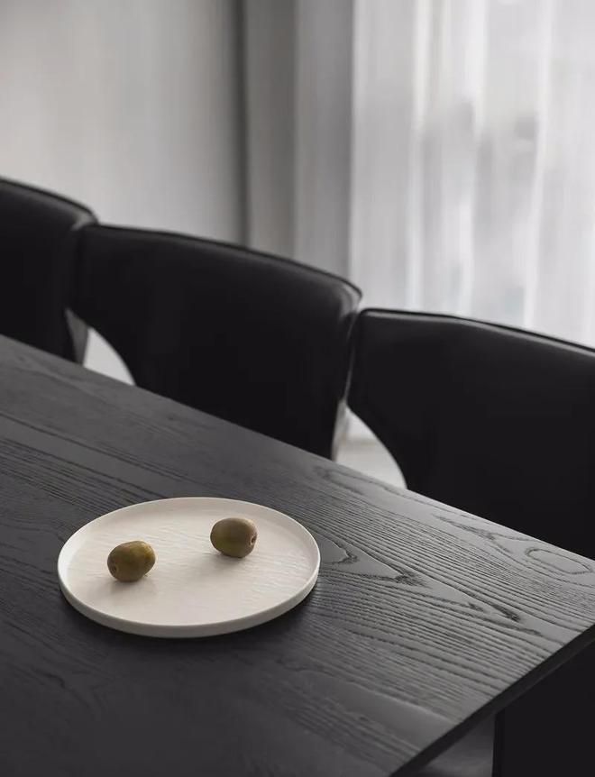 餐厅在灰色地面砖基础,布置黑色实木餐桌与板凳,后方定制白色餐边柜中间加入西厨操作台,布置黑白色的装饰画,还有小盆栽的装饰,也让用餐氛围充满现代优雅的高级感。