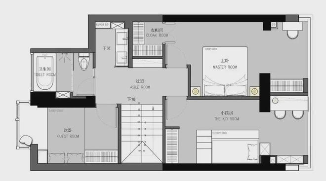 儿童房以淡蓝色的墙面空间,地面布置一席交通主题的地毯,摆上玩具为孩子提供了童趣满满的玩耍空间;白色+浅蓝色的上下床,边上一个仙人掌造型的落地衣帽间,也是增添了空间的实用与童趣气息。