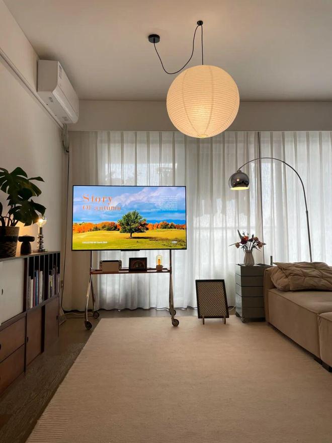 网友@Joy家:我在装修时压根就没考虑过电视墙,一组中古风置物柜+可移动电视支架,就是我最理想家的样子。