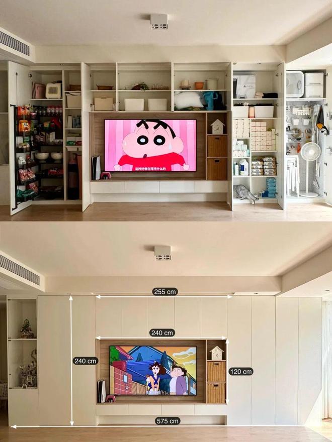网友@花椒的家:晒晒我家5.75m长的电视满墙柜,整体结构上大致分成了三块。左边零食区、中间电视区和杂物区、右边日用品区和家政区(阳台柜)。