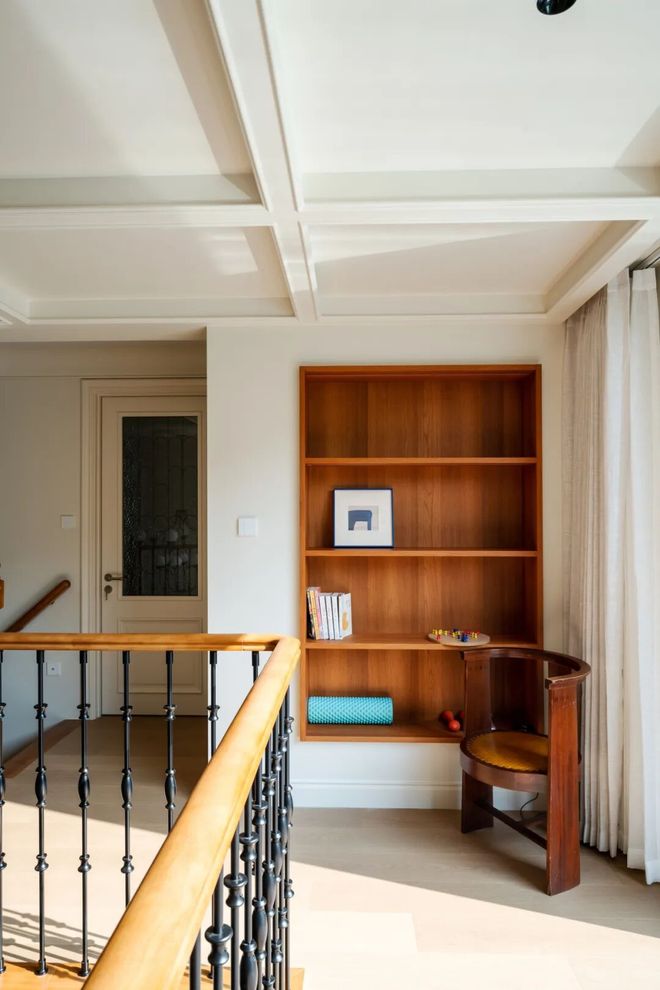 与一楼联系较为密切的过道阅读区,不仅可以一览楼下的起居活动,增强家人间的互动与联系,也能在二楼南向平台阳光过强时,作为阅读赏景两不误的补充阅读空间存在。