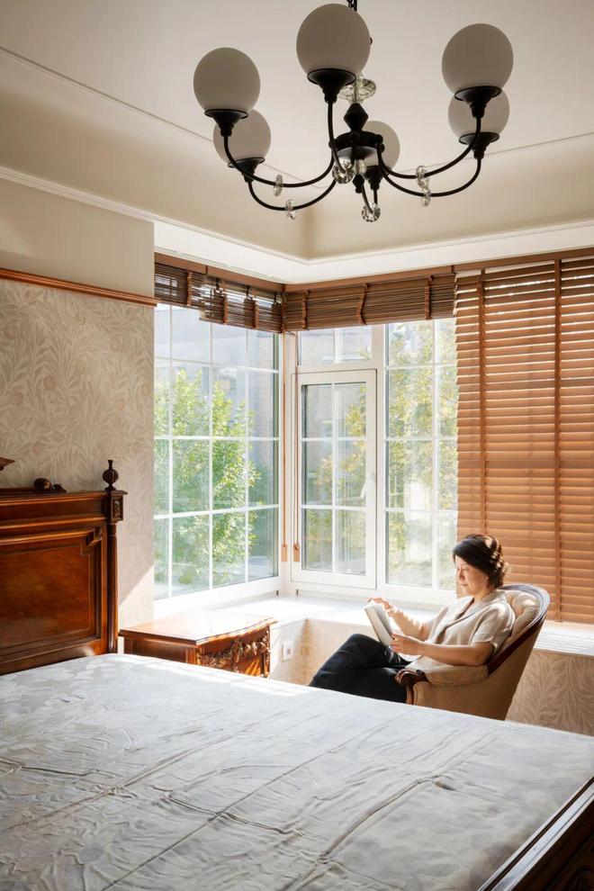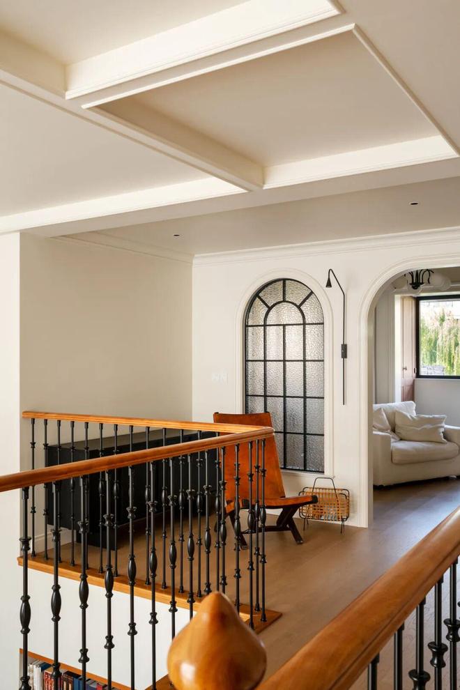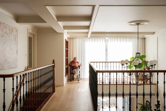 二楼的护栏扶手呼应整屋法式复古格调,采用柚木搭配黑色铁艺栏杆,勾勒出精致的法式骨架,同时顶部悬挂极具仪式感的大型主灯,不仅成为空间的视觉焦点,更巧妙串联起上下两层空间,强化了整体的纵向联系,也让一楼与二楼的互动更为紧密,阿姨平时在二楼时,可随时透过挑空区域与一楼的叔叔交流,让二人世界的陪伴不被空间阻隔。
