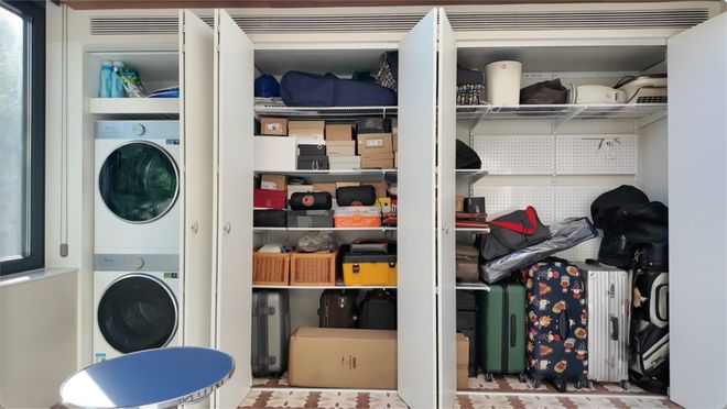 这里还专门规划了洗烘区,满足了长辈洗完衣物后仍希望晾晒一番的需求,除此之外,一面功能完备的“家政墙”,配备灵活可调的货架系统,搭配折叠式滑轨门,既不占用多余活动空间,又能让屋主随心收纳行李箱等大件物品,补足了全屋的储物空间。