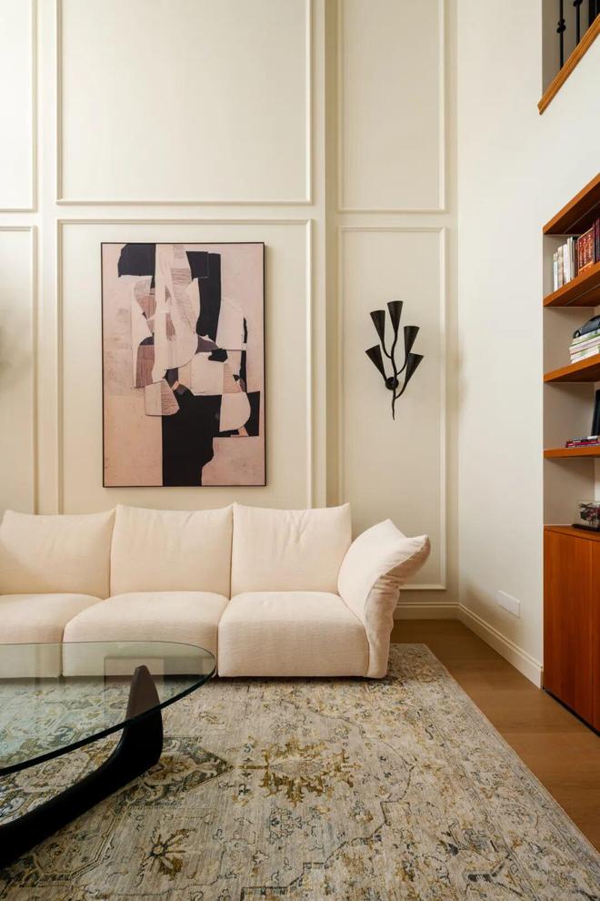 整面柜体采用分段式设计,下部选用木色,上部搭配白色,既降低了视觉重心,也让整个空间更显沉稳大气。柜体下半部分的封闭柜门,能够将常用的零散物品妥善遮挡,避免杂乱外露,让家始终保持整洁有序;而开放格区域,除了用来陈列夫妇二人收藏的旅行纪念品与艺术藏品,更核心的功能是收纳并展示他们日常常读的书籍。
