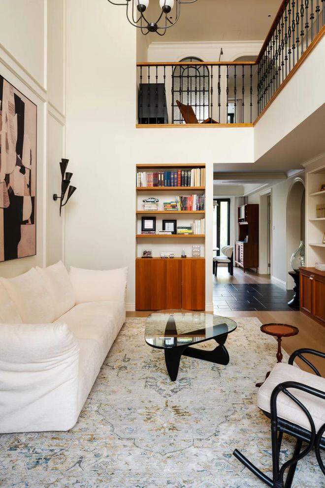 南向客厅是本次改造的核心亮点之一。拆掉二楼加建的书房后,挑空结构被完整释放,客厅得以拥有南向二楼落地窗和一楼阳光房带来的充沛自然采光,光线毫无阻碍地涌入室内,让整个空间显得开阔明亮,彻底摆脱了此前的压抑感。